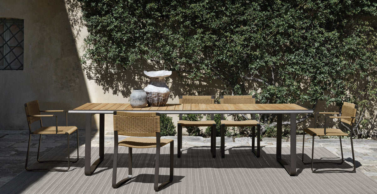 In the seating, the theme of the band of burnished painted aluminium, the fil rouge of the collection, is taken up again in a more leisurely rhythm to create the structure. The bending of the band draws the shape of the backrest and sled bases, with dynamic, agile and angular profiles. A dense, handcrafted polypropylene rope cover is woven onto the metal frame in anthracite, olive green and desert yellow.