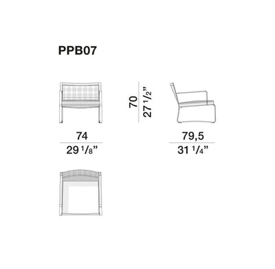 A dense, handcrafted polypropylene rope cover is woven onto the metal frame in anthracite, olive green and desert yellow. In addition to the armchair and chairs, the range includes a large array of products, such as a dining table with seats, a stool, a comfortable sunbed, side tables and a bench.