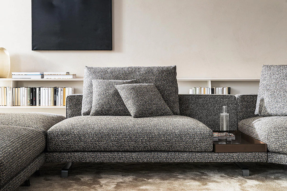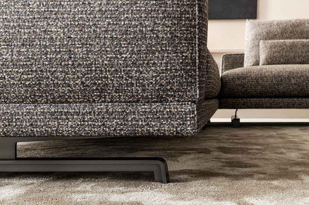 Blade-like extruded steel legs support the base on which rest low rectangular fabric or leather upholstered backrests, of the same thickness as the cosy seat cushions.