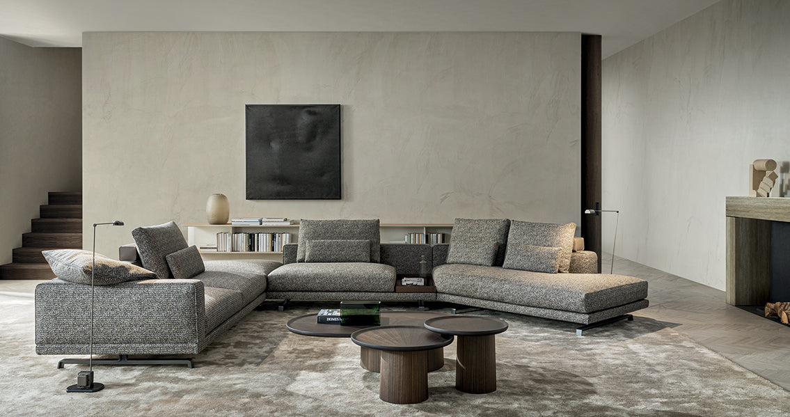 Octave is a system of modular sofas featuring rigorous shapes. A design marked by geometrical lines, based on mix & match modular elements that came together in linear, angular compositions or with the addition of hanging trapezoidal or rectangular elements in unusual and highly appealing configurations.