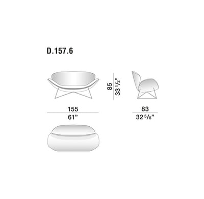 The distinctive silhouette of the D.157.6 loveseat, originally named Due Foglie due to its seamless curvilinear shape reminiscent of a pod and two elongated leaves, is supported by a delicate trestle structure with a metallic finish. The defining feature of the loveseat is undeniably the foam structure, specially shaped by two molds. Beyond its striking aesthetic, this feature offers a unique seating experience: spacious and comfortable for one, yet conducive to the intimate conversations or quiet moments of two.