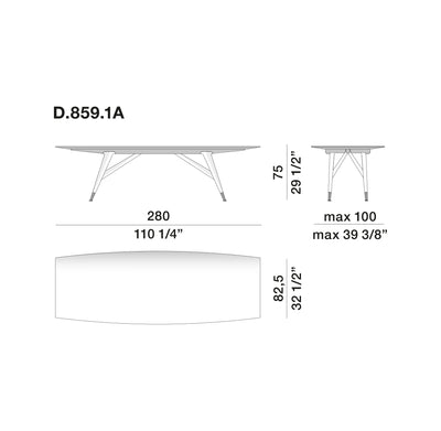 The legs are notable for their fine-membered modernity, creating a trapezoidal single-span bridge upon which the large tapered top conveys the idea of aerodynamics. Originally made of solid ash with bronze ferrules, it is now also available in a darker-toned wood such as Black Stained Ash. In addition to its original dimensions, the D.859.1 is available in two smaller version that faithfully reproduce the harmony and proportions of the original design.